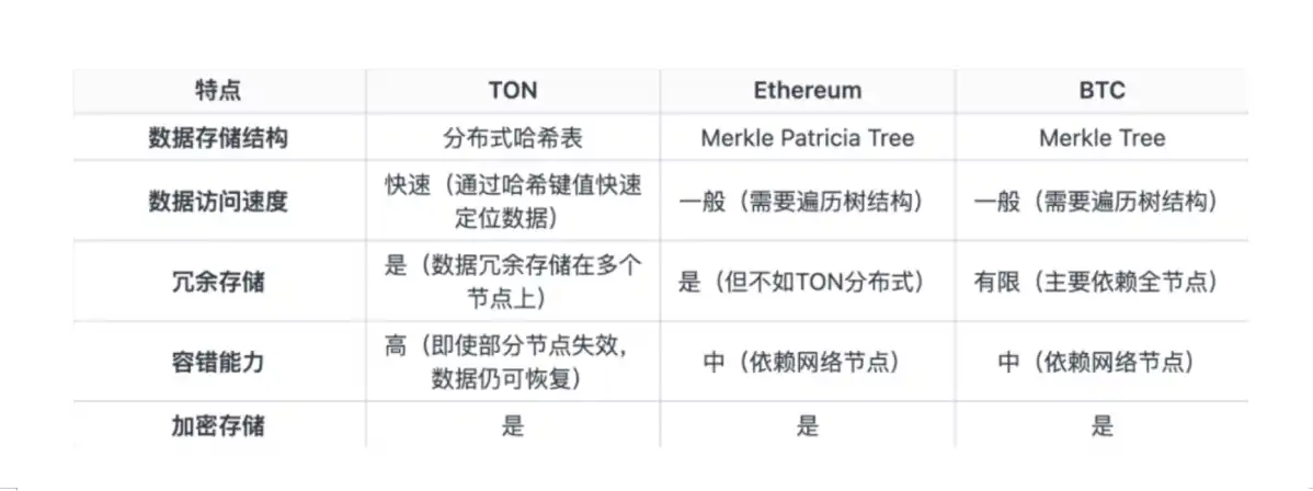 TON 与 Ethereum、Bitcoin 网络的对比,在容错能力、冗余存储等方面优势明显