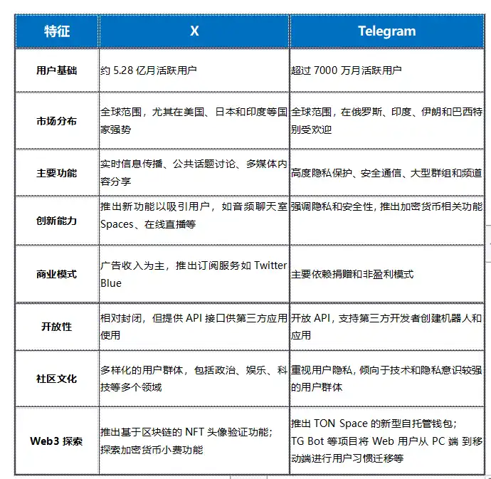 2. X 和 Telegram 在用户市场分布、主要功能、创新能力、商业模式、开放性、社区文化、Web3 探索等方面存在着明显的差异,二者的竞争与合作可能会长期并存。