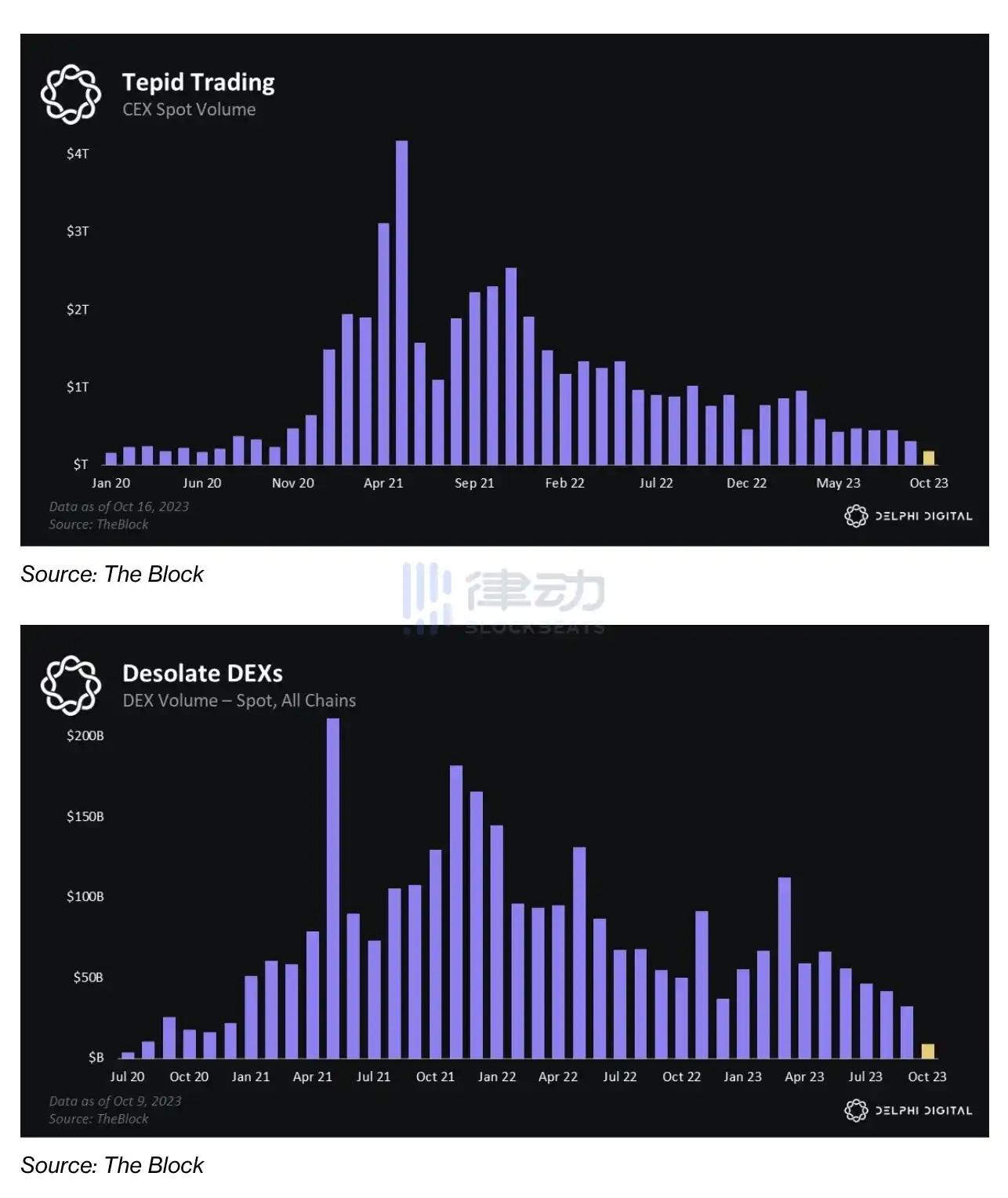 Alameda Research 是 Sam Bankman-Fried 失败的 FTX 数字帝国的交易部门。Kaiko 的研究人员表示,这种挥之不去的影响很大程度上是 FTX 崩溃后做市商遭受巨大损失的结果。 根据加密货币研究公司 Delphi Digital 编制的数据,在现货市场上,集中式和去中心化交易所的总交易量处于多年来的低点。Delphi Digital 分析师 Michael Rinko 表示:「流动性继续流出而不是流入加密货币市场的根本原因是高利率。」