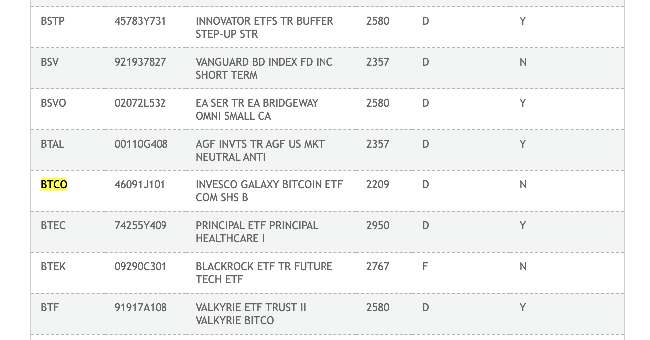 Invesco和Galaxy的现货比特币(BTC)交易所交易基金(ETF)的代码--BTCO--已经出现在存管信托和清算公司(DTCC)的网站上,标志着这两家资产管理公司在申请过程中向前迈出了一步。