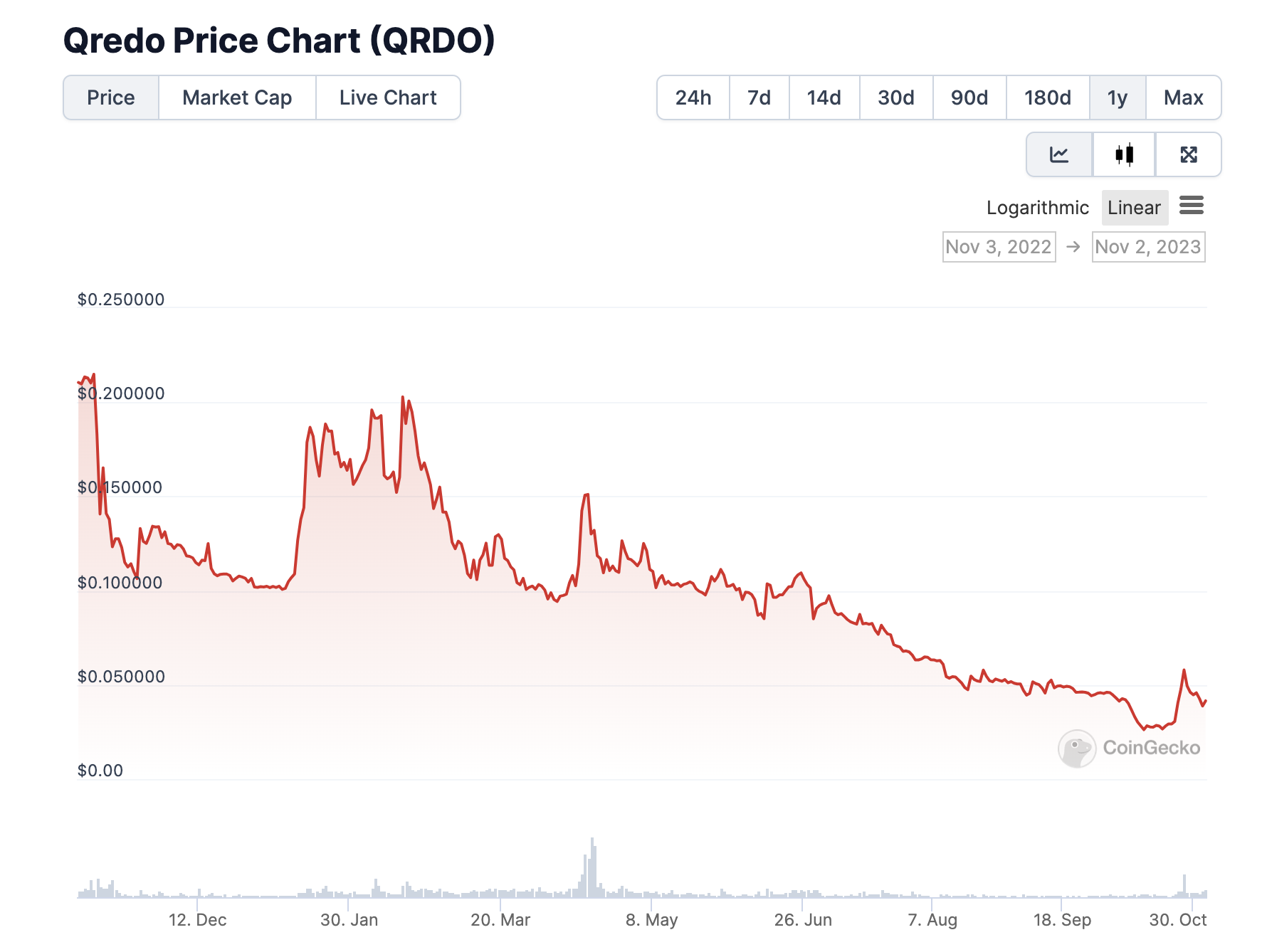 根据 CoinGecko 的数据,QRDO 代币经历了大幅下跌,从 2021 年 11 月的峰值价格 9.81 美元跌至目前约 0.0415 美元,跌幅近 100%。