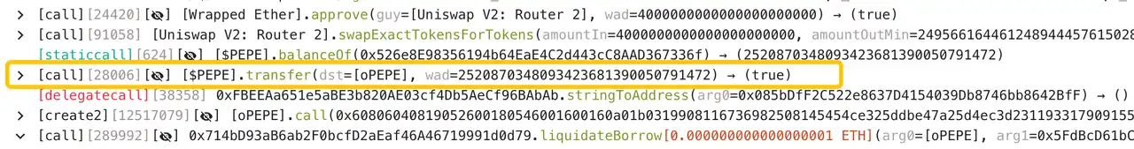 f. 由于精度损失问题,仅赎回了 1 wei 的$oPEPE 就换取了 2,520,870,348,093 个$PEPE