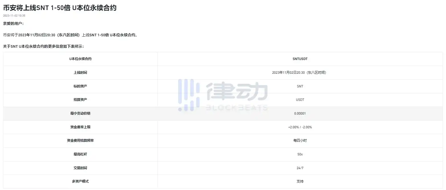 据官方公告,Binance 将于 2023 年 11 月 02 日 20:30(东八区时间)上线 SNT 1-50 倍 U 本位永续合约。