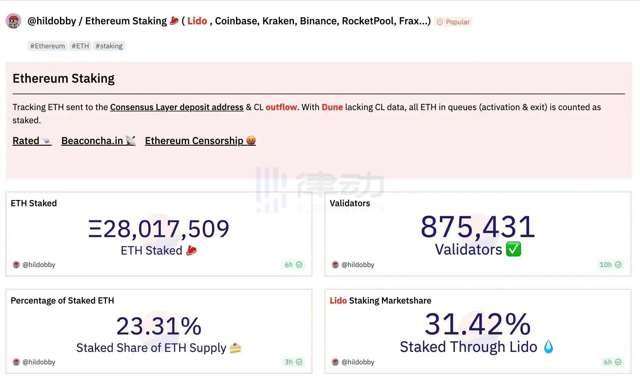 以太坊信标链质押总量突破 2800 万枚 ETH,上海升级后净流入逾 838 万枚 ETH