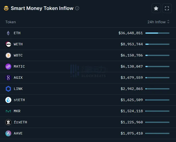 Smart Money 24 小时流入榜:MATIC、AGIX、LINK 位居前列