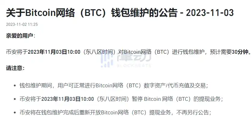 Binance 将于 11 月 3 日 10:00 对 Bitcoin 网络进行钱包维护,预计需要 30 分钟