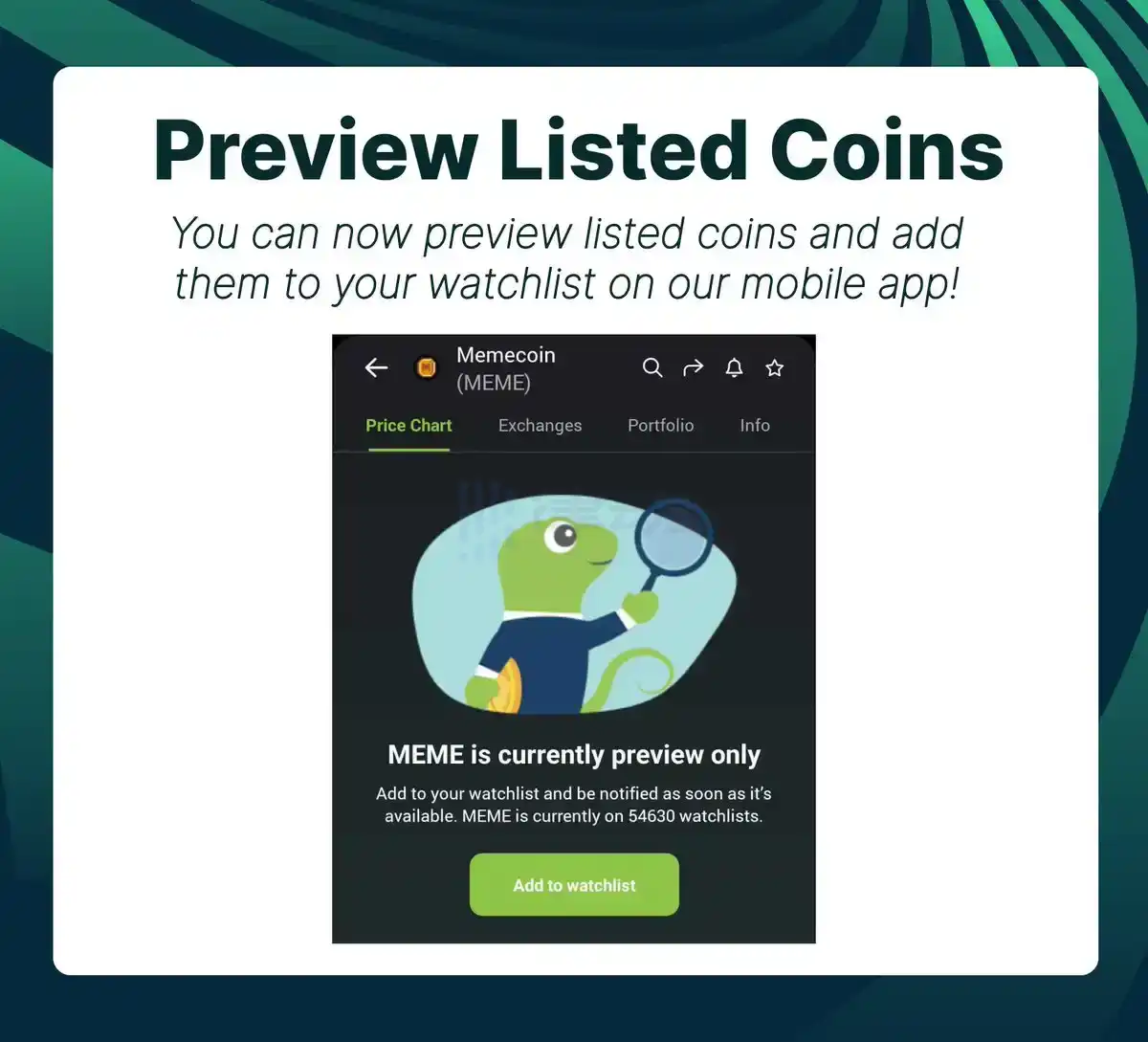 11 月 2 日,CoinGecko 宣布推出其最新功能,用户现在可以搜索并预览即将上市的币种,将其添加到关注列表,并在交易开始时即时捕获价格变动。该平台已预先列出了 MEME 代币。