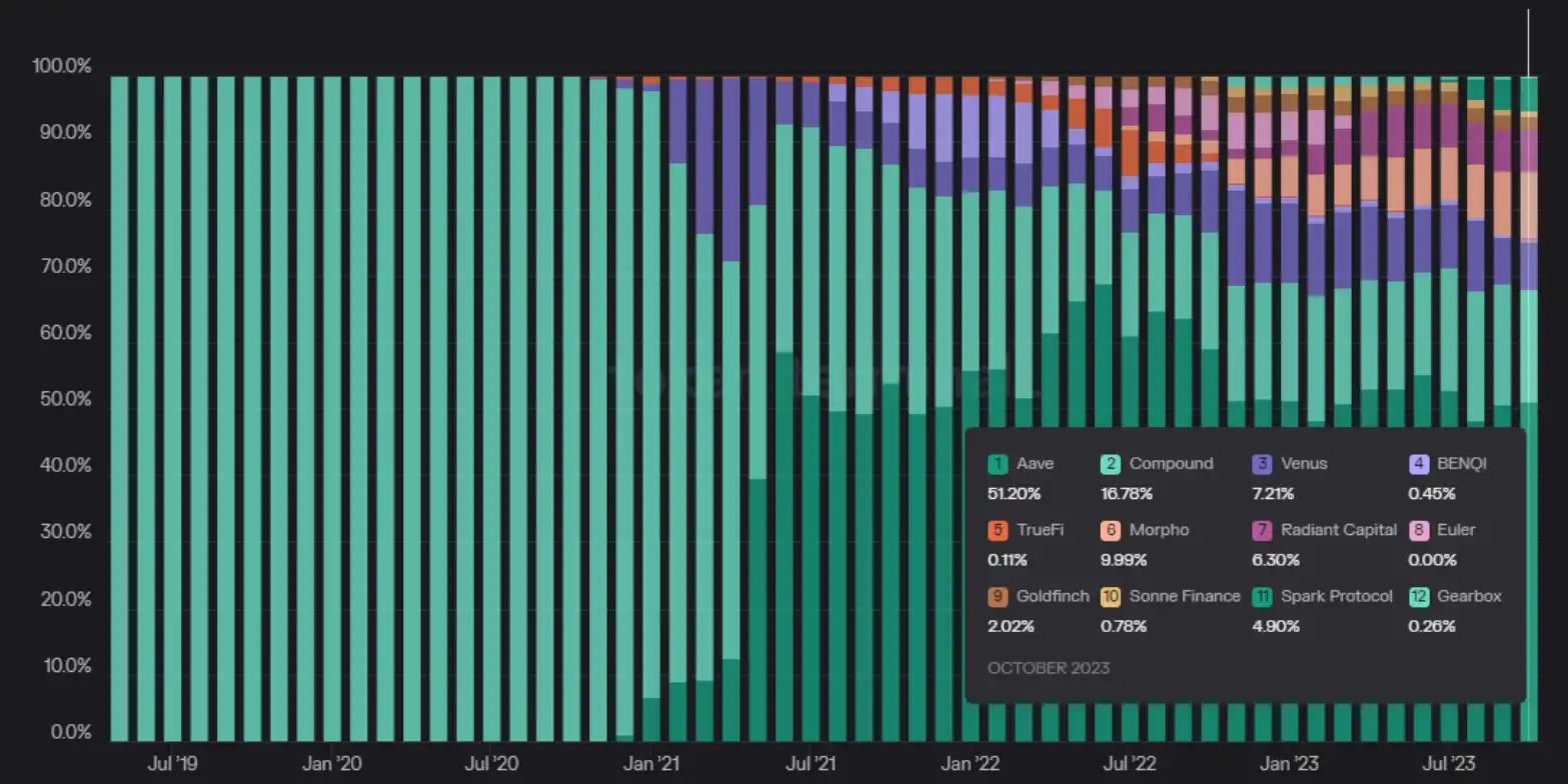 1. 市场份额更为稳固。下图为 2019 年 5 月至 2023 年 10 月各项目的活跃借贷量的占比变化情况。自从 2021 年中 Aave 发力以来,其市场份额一直稳定在 50-60% 区间,而第二名 Compound 虽然份额不断被挤压,但至今排名仍旧比较稳固。
