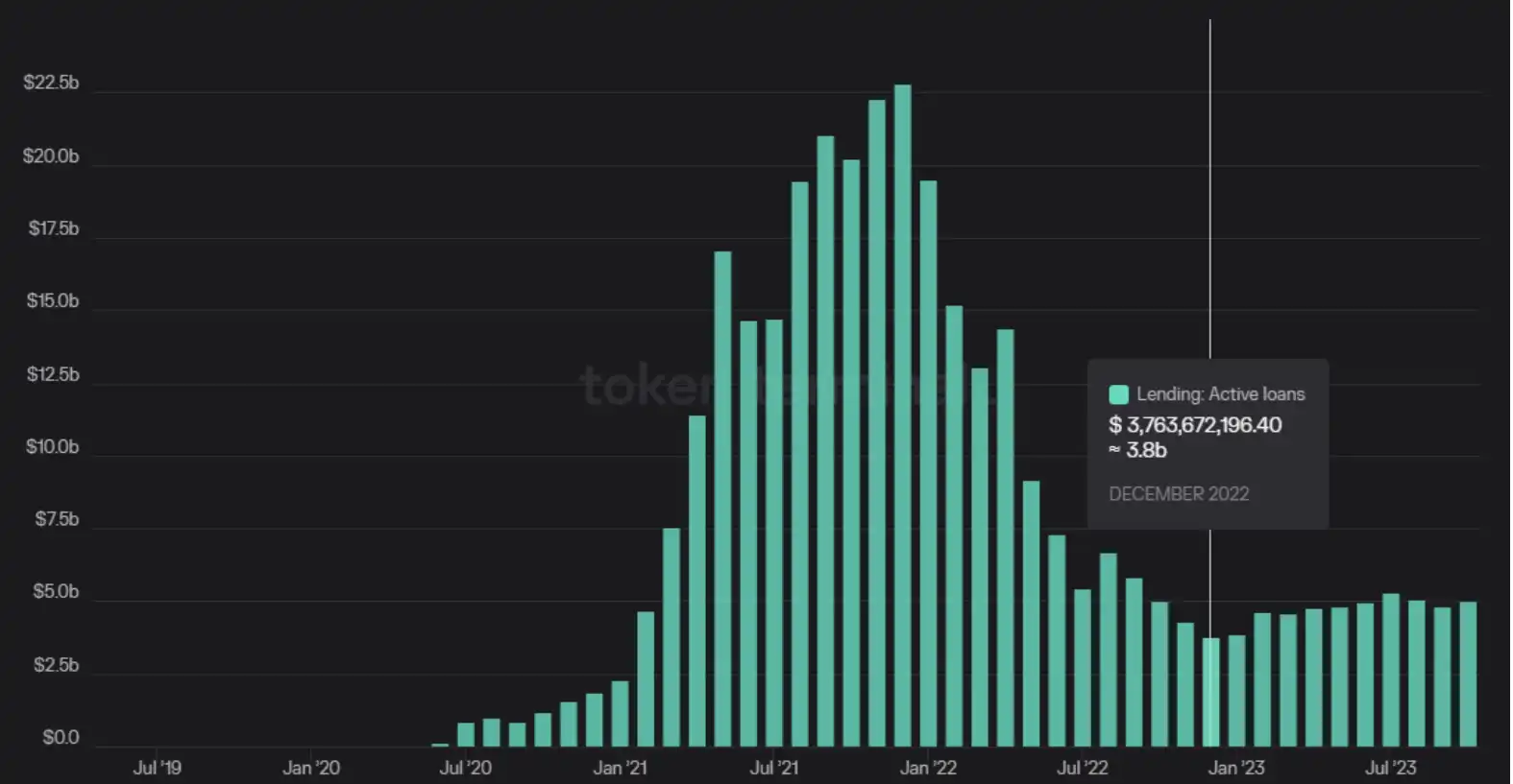 下图为 2019 年 5 月至 2023 年 10 月的 web3 借贷市场活跃贷款量变化,从最初的几十万美元,到 2021 年 11 月高峰期的 225 亿美金,再到 2022 年 11 月最低谷时期的 38 亿美金,现在则为 50 亿美金,借贷市场业务量正在缓慢地探底回升,在熊市中依旧表现出了较好的商业韧性。