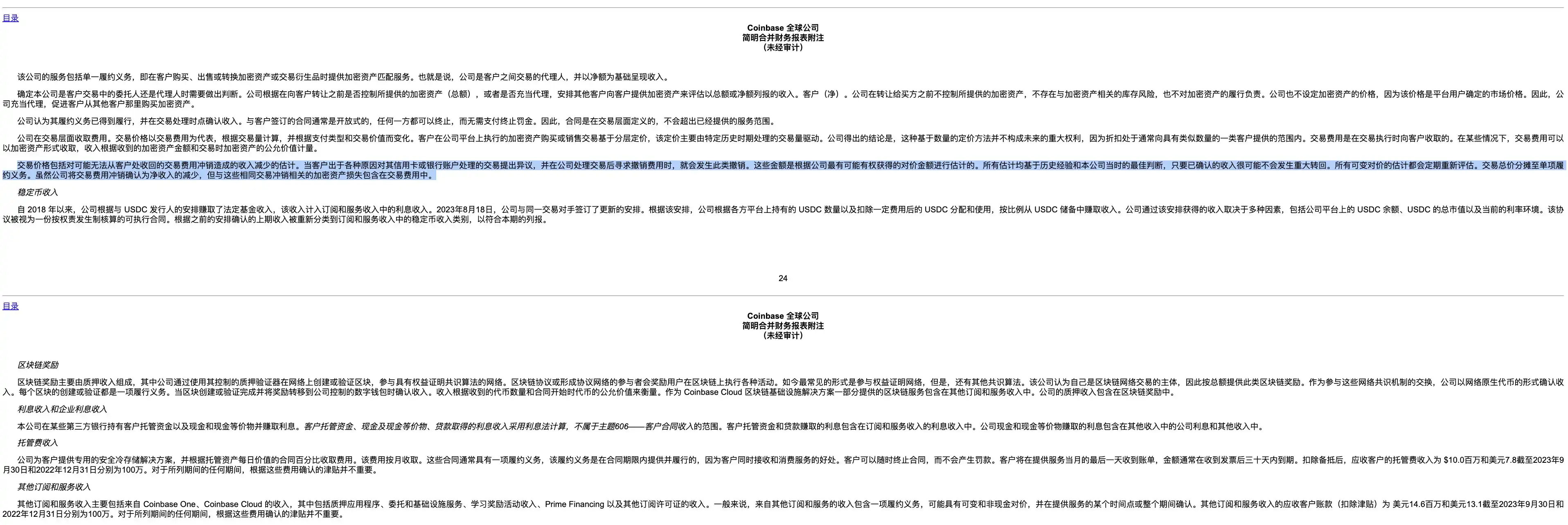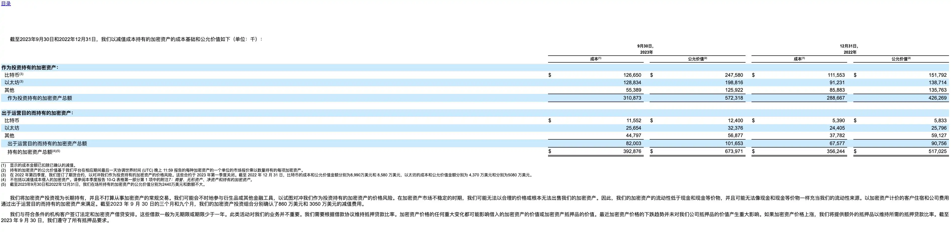 下一个数据就是 Coinbase 自持有的加密货币资产总额,这对于很多小伙伴对于「狗庄」的判断与否提供了数据,截止到 2023 年的 9 月 30 日,Coinbase 总持有的作为投资用加密货币的总值是 5.72 亿美元,成本是 3.1 亿美元,同时对于投资持有 Coinbase 也有专门的解释,大体的意思是 Coinbase 不打算频繁性的交易这些资产,也会通过衍生品或者其他金融工具进行对冲,甚至有可能会将这些资产借贷出去。目前九个月的总持仓成本和公允价值都超过去年全年的数据,说人话就是进入了 2023 年以后 Coinbase 加大了对于加密货币的抄底,买入了更多的资产,并且已经盈利超过 2.6 亿美元,高于去年全年不到 1.4 亿美元的收入。