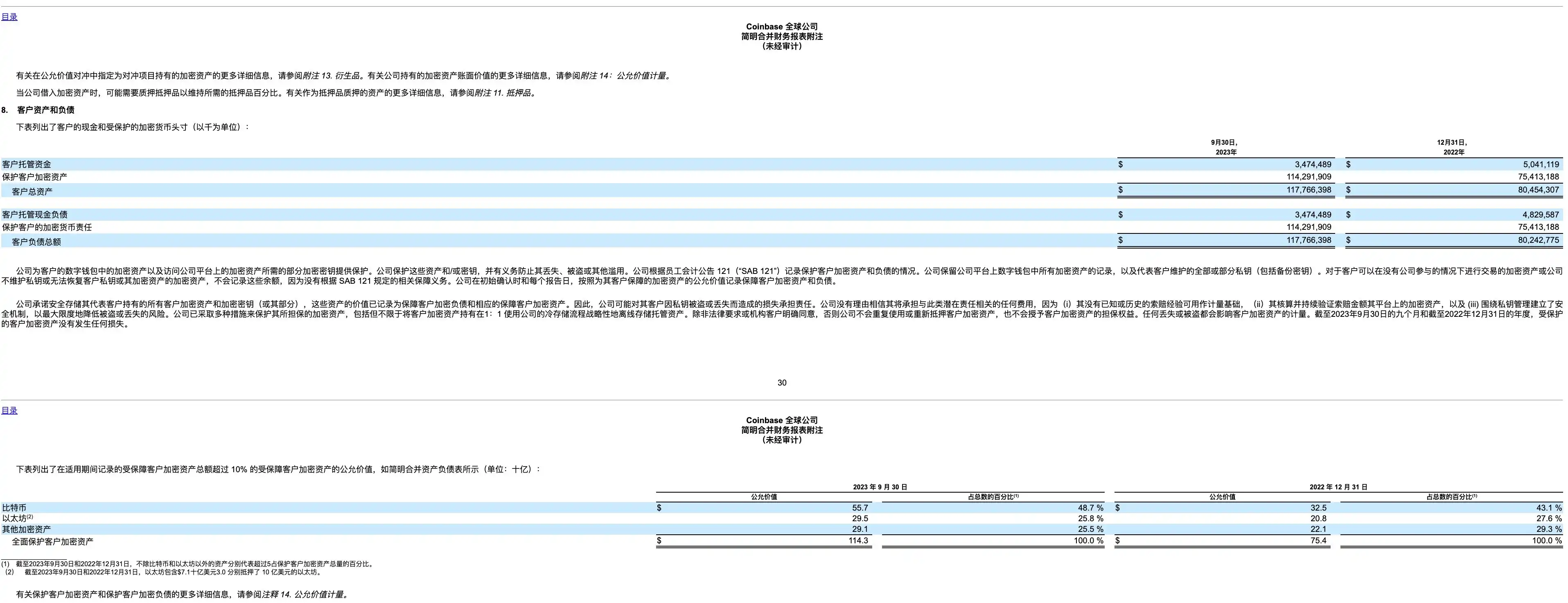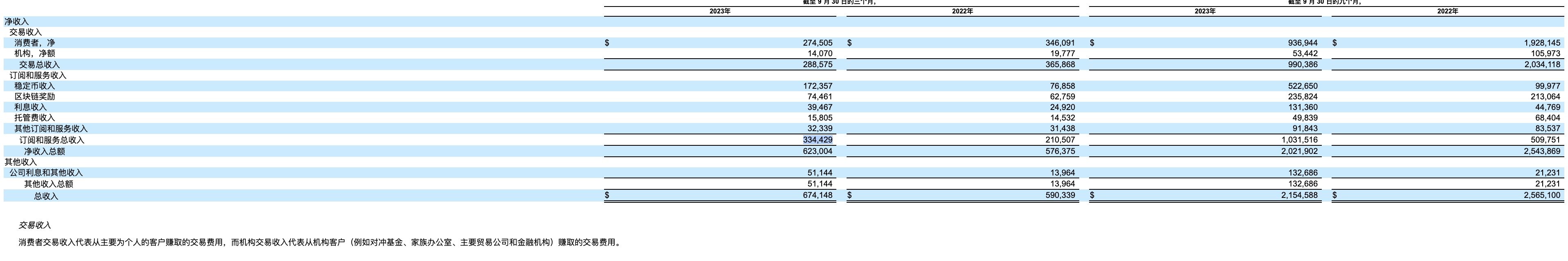 另一个需要关注的事情是,Coinbase 对于客户的托管和资产保护增加了不少,截止到 2023 年的前九个月总持有的客户资产就超过了 1,177.6 亿美元,高于去年全年的 804.5 亿美元,要知道目前整个加密货币的市值也就是 1.28 万亿,这还是 BTC 和 ETH 带动下整体大盘大幅上涨的结果,而九月底的时候也就是 1 万亿美元出头,而 Coinbase 的用户储存就占了币市整体市值的 10% 以上,说来很可笑,这主要代表的是目前更多的用户对于去中心化存贮的不信任,反而是更加的信任中心化存储,当然 Coinbase 也买了保险并且提供全额赔付,而且托管的费用确实也不高。