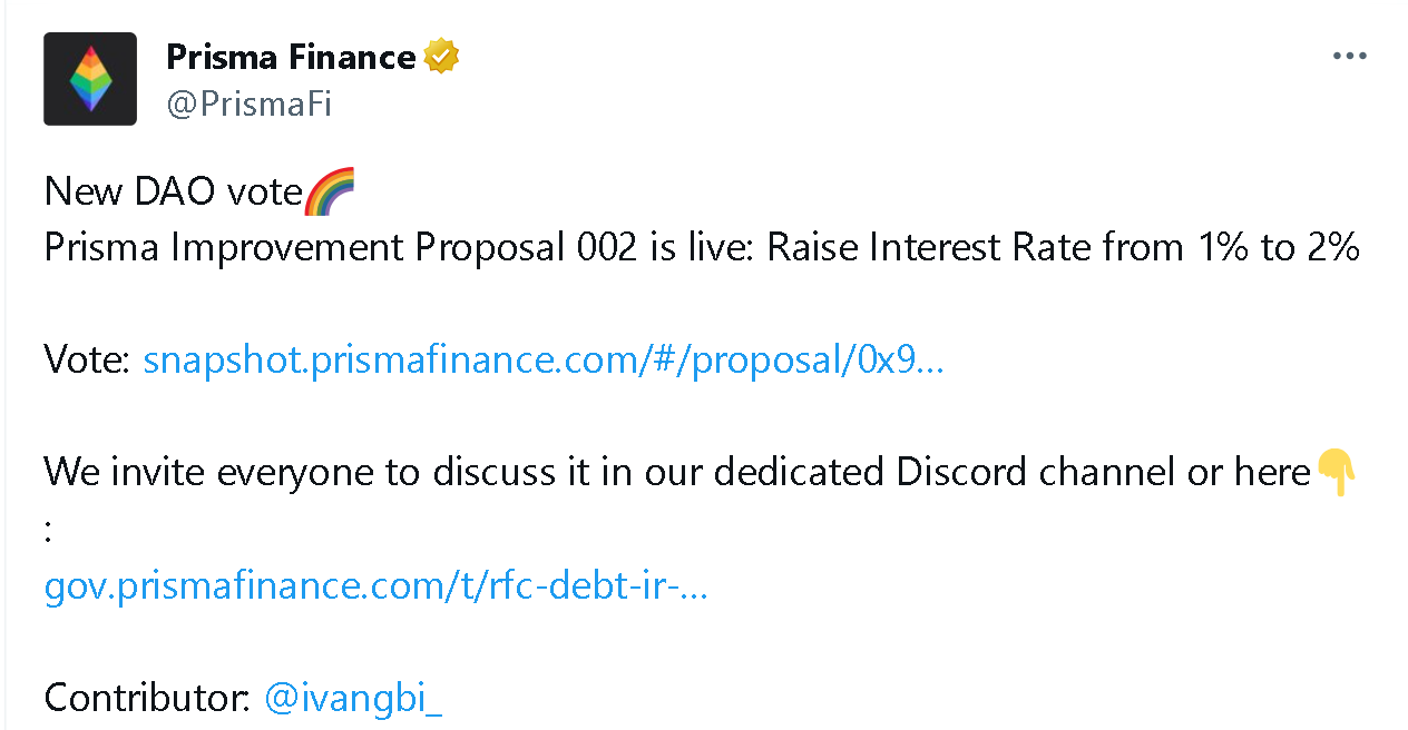 三天前,Prisma Finance 官推才刚宣布推出首个提案 PIP-001,旨在将 Lido Finance 的 wstETH 金库债务上限从当前的 1 亿枚 mkUSD 增加到 2 亿枚 mkUSD,允许更多用户参与铸造 mkUSD。