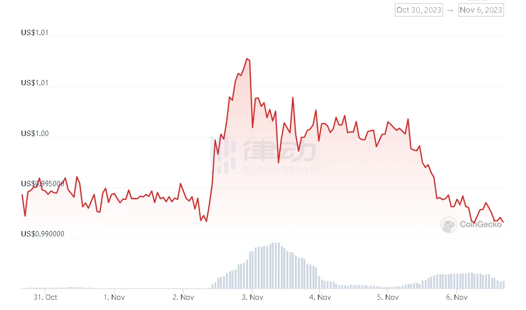 早在 8 月 29 日,Prisma Finance 在其社交平台表示「已成功购入并锁定了 200 万枚 CRV,此次收购将在 Prisma 推出之前增强 mkUSD 的流动性」。如今 Prisma 推出不足一周,据 coingecko 数据,mkUSD 交易量较 11 月 3 日的顶点已下降约 1/5,价格也出现小幅度脱锚。