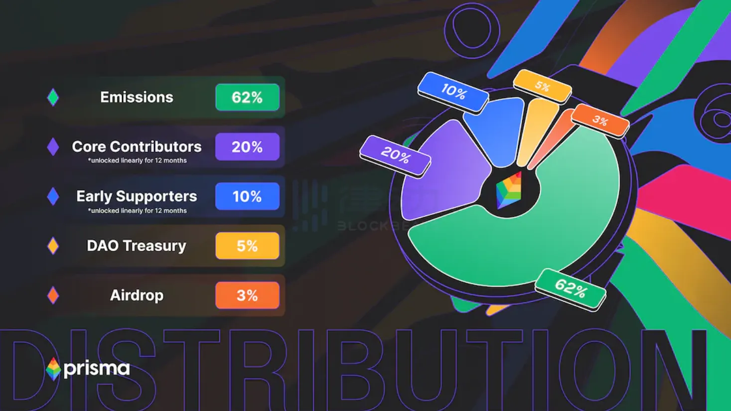 据悉,PRISMA 总量 3 亿枚,其中 62%(1.86 亿枚 PRISMA)由 Prisma DAO 用于激励 Prisma 协议内的某些行动和流动性池的流动性;20%(6000 万枚 PRISMA)分配给核心贡献者,这些代币将从创世开始进行 12 个月线性解锁 ;10%(3000 万枚 PRISMA)分配给早期支持者,5%(1500 万枚 PRISMA)将存放在 Prisma DAO 金库中;3%(900 万枚 PRISMA)将分配给 veCRV 投票者和 Prisma 积分持有者。