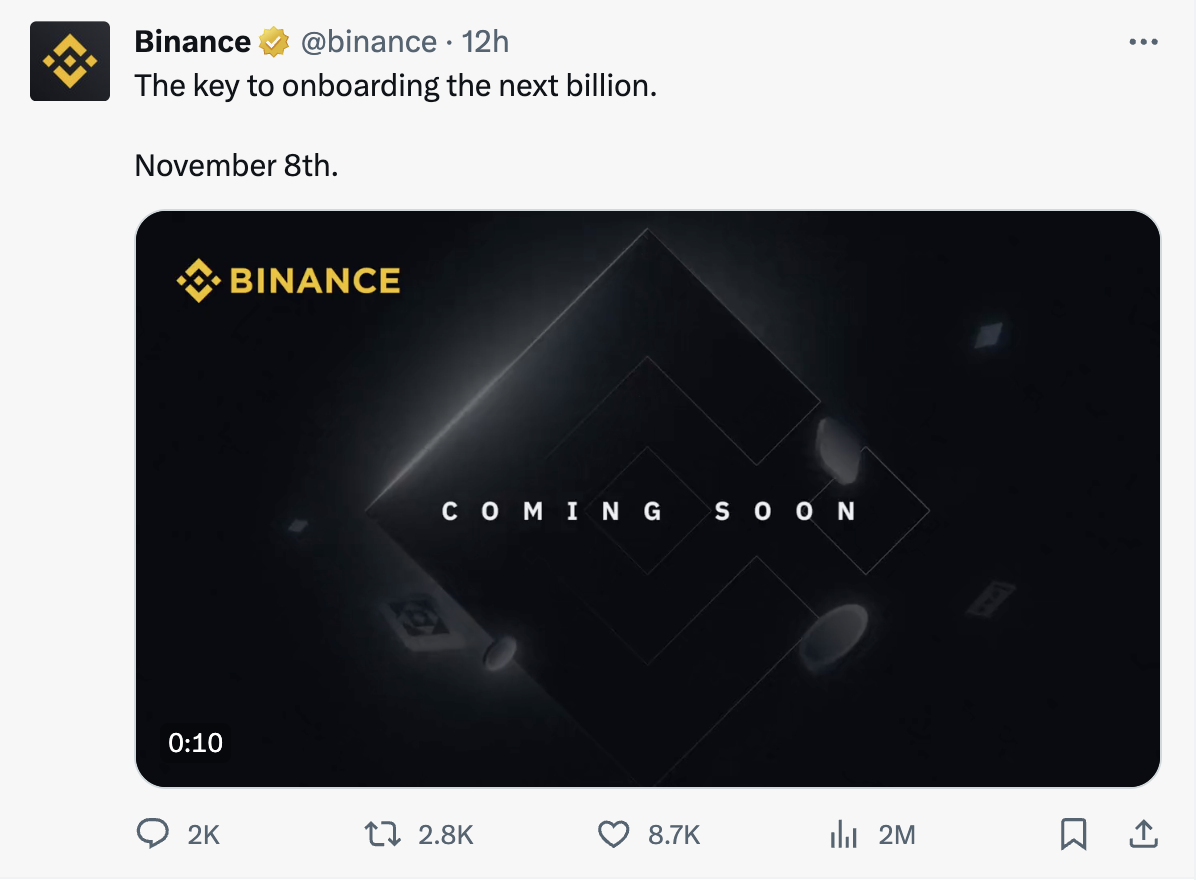 在此之前 Binance 官方于社交平台推出新预告,或将于 11 月 8 日发布全新产品,并配文「吸引下一个十亿级别用户的关键。」