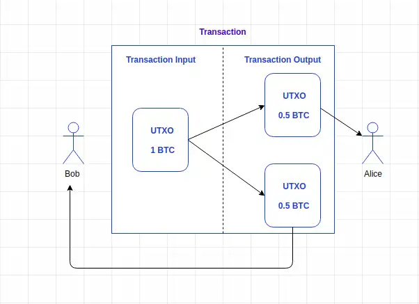 你是 Bob,你有 1 个 BTC,那么他是在一个 UTXO 中体现的,现在你向 Alice 转 0.5 个 BTC(这里我们忽略 gas fee),那么最后会生成两个 UTXO,一个是你自己负责的 0.5BTC 的新 UTXO(右下),一个是 Alice 负责的新 UTXO(右上),原来的 UTXO 就不可用了。当然,如果你的输入(左边)是几个 UTXO 的结合(比如 1BTC 实际上是 0.8BTC+0.2BTC 的 UTXO 的组合),那么情况就会更复杂。