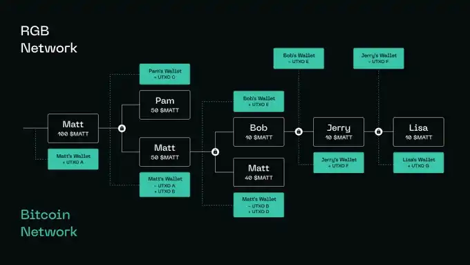 RGB 协议利用了比特币主网 UTXO 的安全性,为其链下的资产发行或合约逻辑的安全性背书。