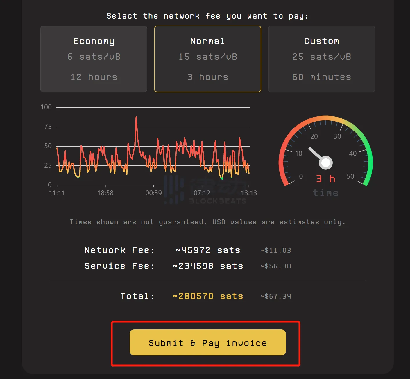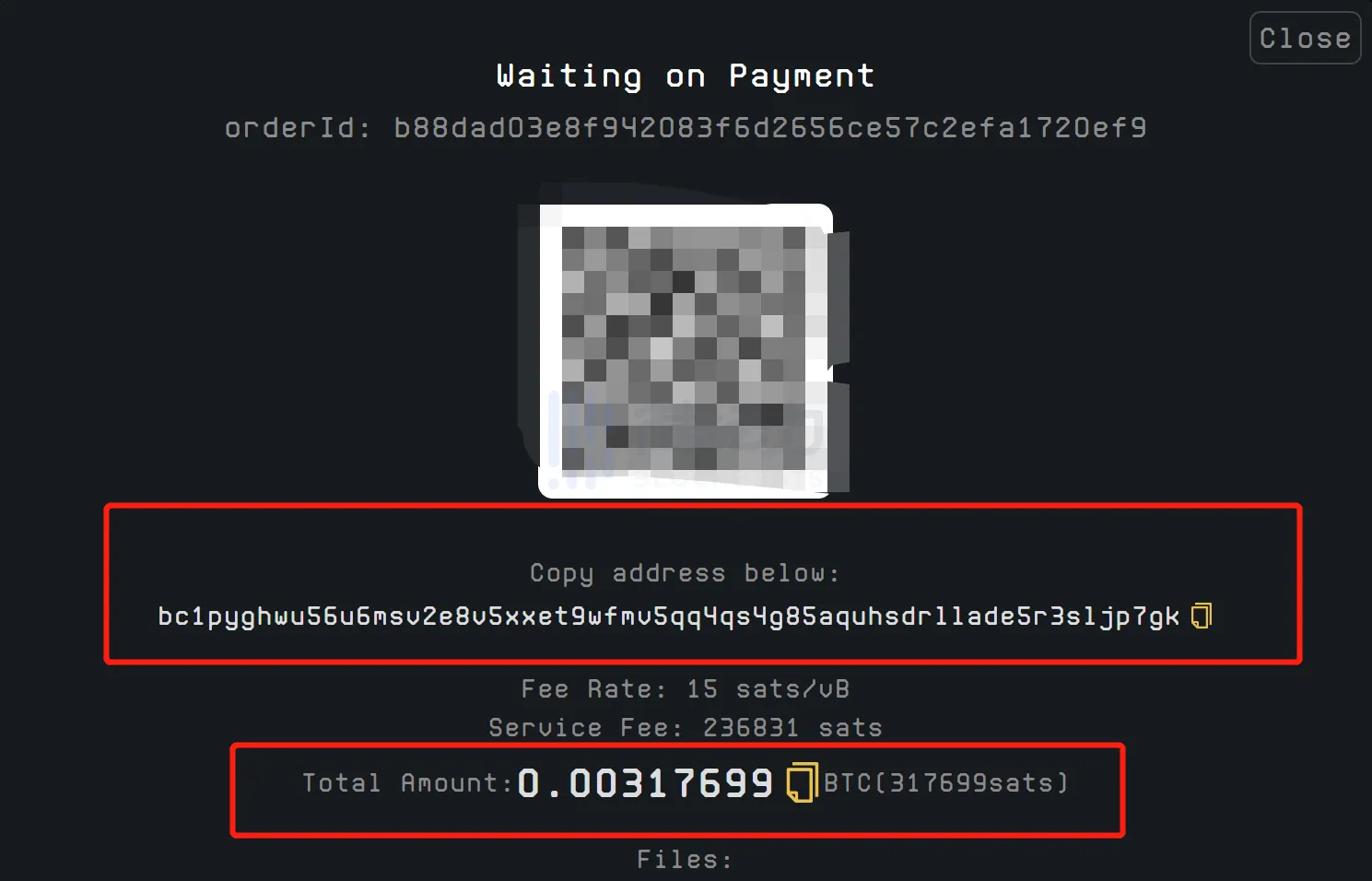 「Copy address below」下方显示的是打款地址,「Total Amount」显示的是打款金额。使用自己的比特币钱包完成转账以后等待铭文到账即可。