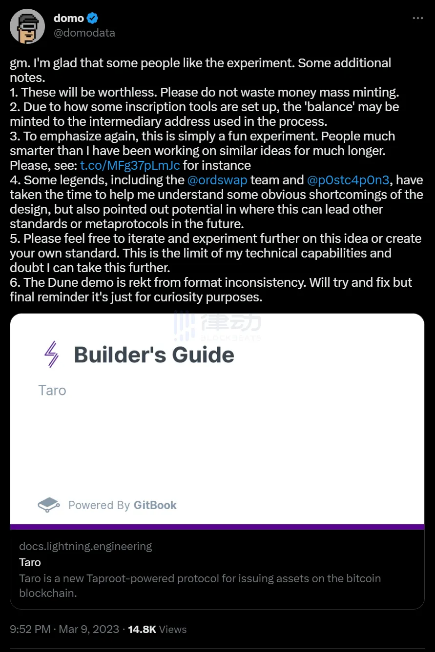 @domodata 将自己称为一个「实验者」。他感谢大家对 BRC-20 这个「实验」的喜爱,也劝大家不要在 Mint 上浪费大量的资金,Salute。