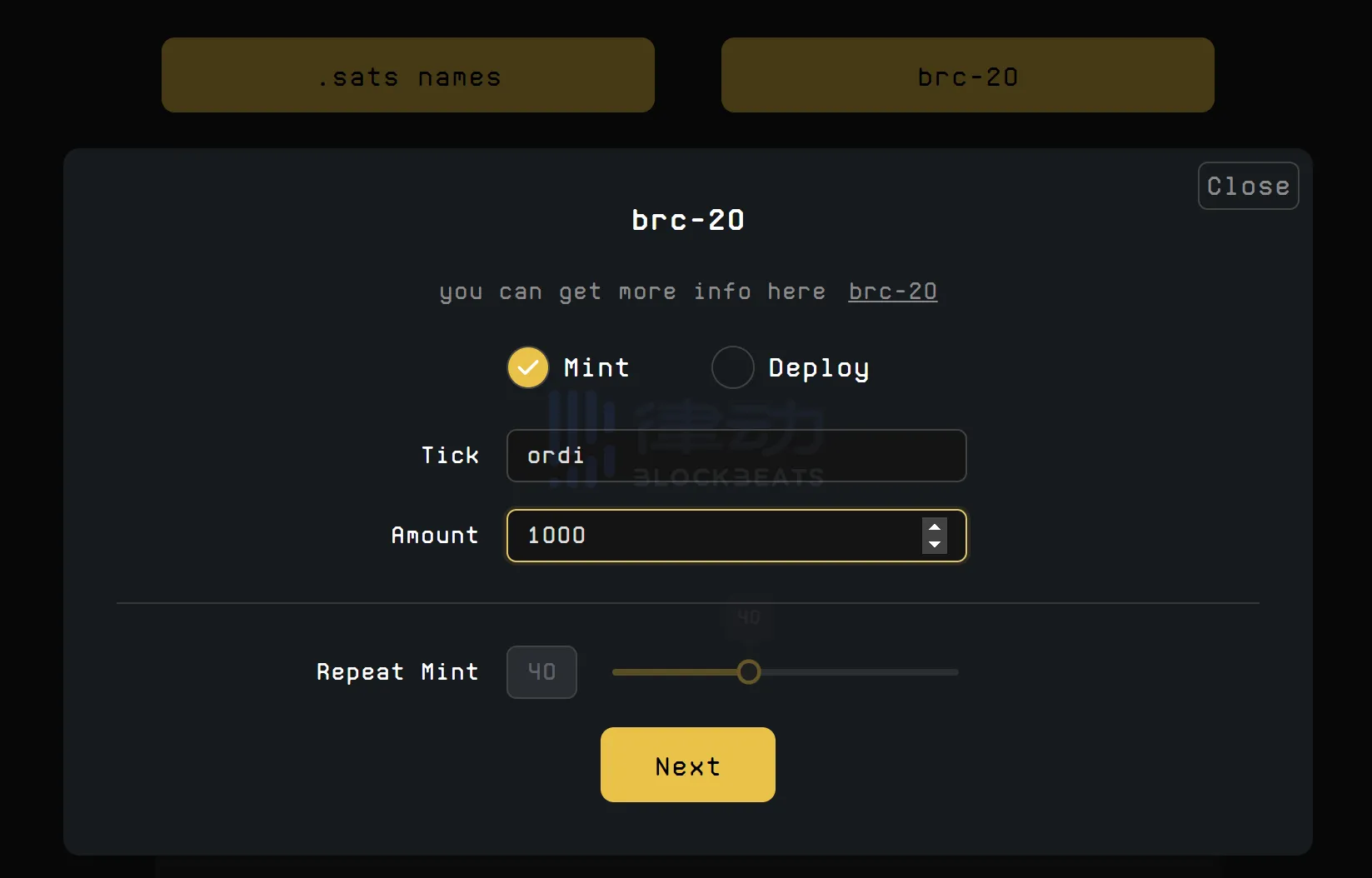 「Tick」栏里填写要 Mint 的 BRC-20 Token 名称。「Amount」栏里填写每个铭文包含的 Token 数量(比如$ordi 部署时设定的最高值是 1000,这里就填 1000)。最下面的「Repeat Mint」设定的是批量 Mint 的数量。(注:上文已提及 $ordi 已经大概率全部 Mint 完成。上图只做示例作用,此时不要再冒无效 Mint 的风险)