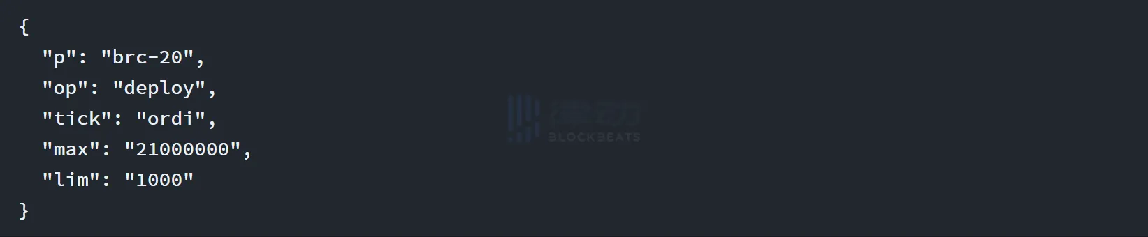 使用 Ordinals 协议刻录下图所示文本来部署 BRC-20 Token: