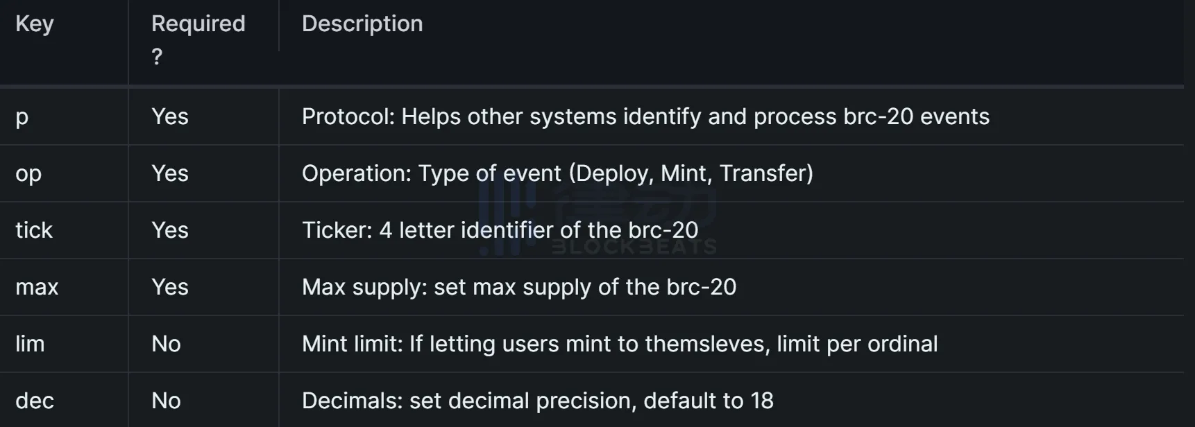 「dec」:十进制精度。非必须包含的关键词,该关键词定义 BRC-20 Token 的十进制精度,默认设置为 18。