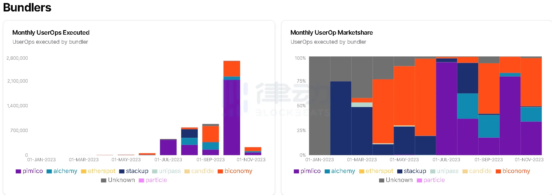 目前,根据 bundlebear 数据,Pimlico 捆绑器每月执行的用户操作和每月用户运营市场份额均位居前列。
