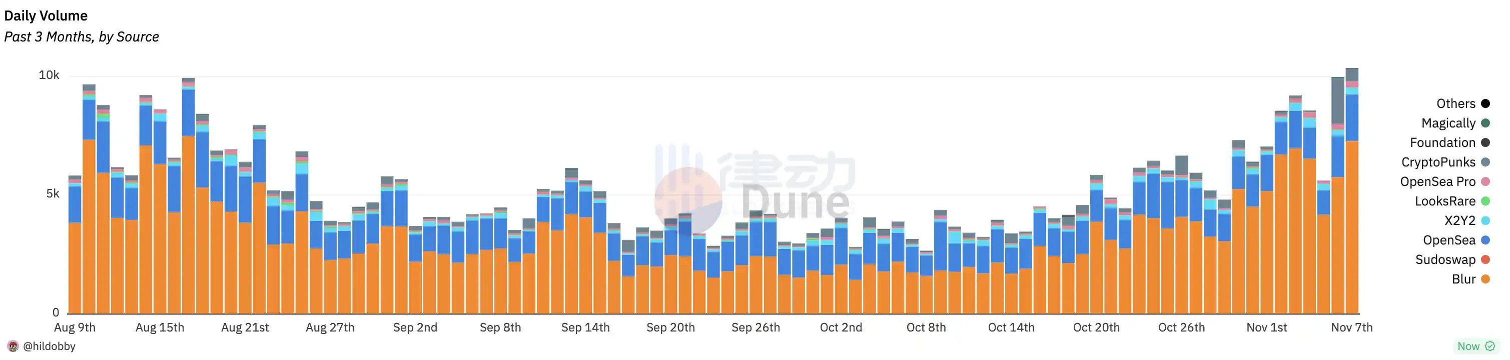 消息,11 月 8 日,据 Dune 数据,昨日以太坊 NFT 交易量突破 1 万枚 ETH,达到 10,351 枚 ETH,创近三个月新高。