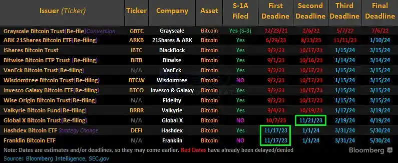 消息,11 月 9 日,彭博 ETF 分析师 James Seyffart 在社交媒体发文表示,「我今天发布了一份新的研究笔记。我们仍然相信到 1 月 10 日之前,现货比特币交易平台交易基金(ETF)的批准有 90% 的几率。但如果提前批准,我们将进入一个阶段,在这个阶段,所有当前申请人的批准许可有可能出现。」 此外,Seyffart 表示,SEC 同时向 BlackRock、Bitwise、VanEck、WisdomTree、Invesco、Fidelity 和 Valkyrie 发布了延迟命令。如果 SEC 想要在今年批准所有 12 个现货比特币交易平台交易基金(ETF)申请,它只剩下最后一个短暂窗口。 这个包括所有 12 家的窗口将在 11 月 17 日结束。但理论上,SEC 在从现在到 2024 年 1 月 10 日的任何时刻都可以对名单上的前 9 家做出决定。