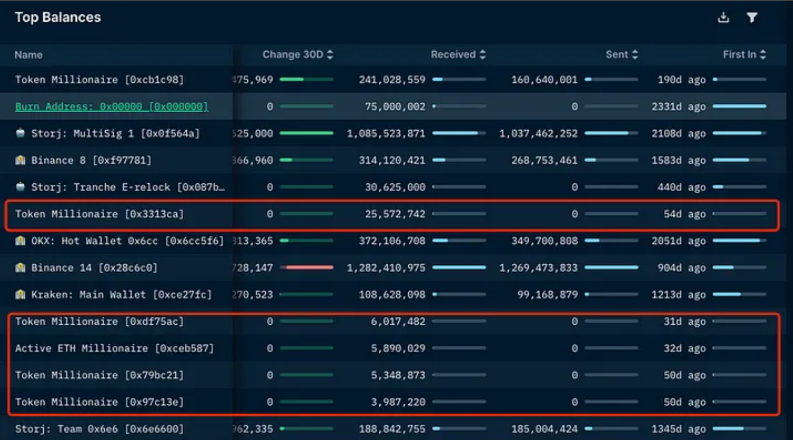 根据历史跟踪,前 50 持币地址中存在多个新建地址在近 60 天内持续从交易所进行大额提币,持有代币量占总量的 10.7%。