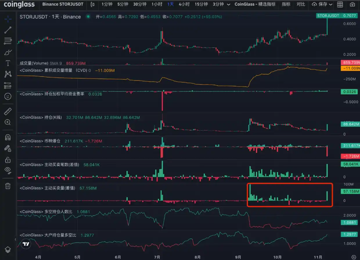 从 STORJ 1 天级别 k 线数据可看到,STORJ 主动买单从 9 月 9 日开始增加,价格随之上涨。从 10 月 10 日开始,在主卖无放量的情况下,STORJ 进行了长达 1 个月的盘整,我们认为在此期间主力仍然存在。STORJ 主动买量在 11 月 9 日迅速上涨,并带动价格迅速上涨突破长期盘整区间,同时伴随大户持仓量多空比提高,全账户多空比降低,大户和散户形成对手盘。