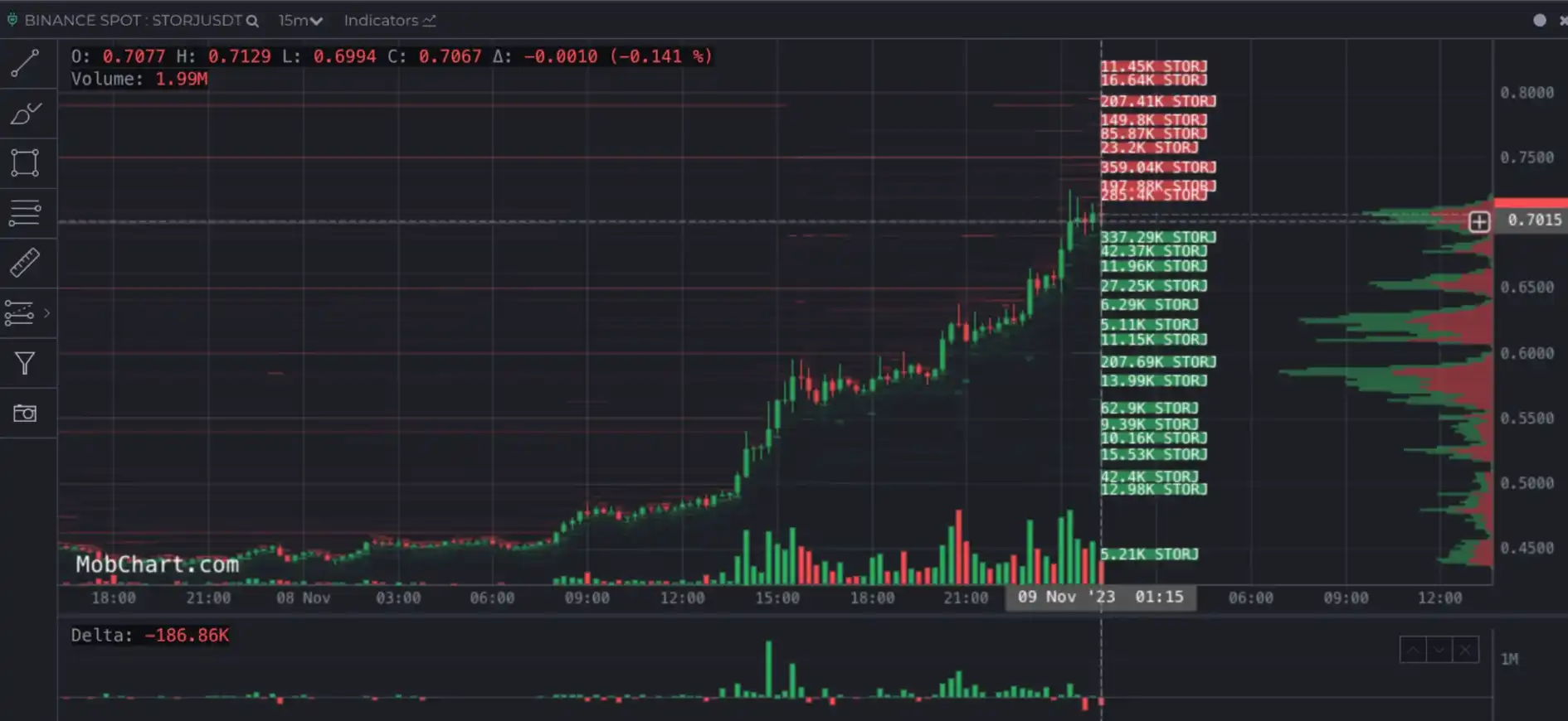 STORJ 过去 24 小时在 Binance 上交易量为 8400 万美元,占流通市值的 32%。从当前 Binance 现货挂单来看,主要挂单集中在盘口,上下资金分布较为均匀。下方大额订单价格集中在 0.6 美元,上方短期大额订单阻力可能集中在 0.75 美元。(需警惕市价抛售和底部挂单撤单行为。)