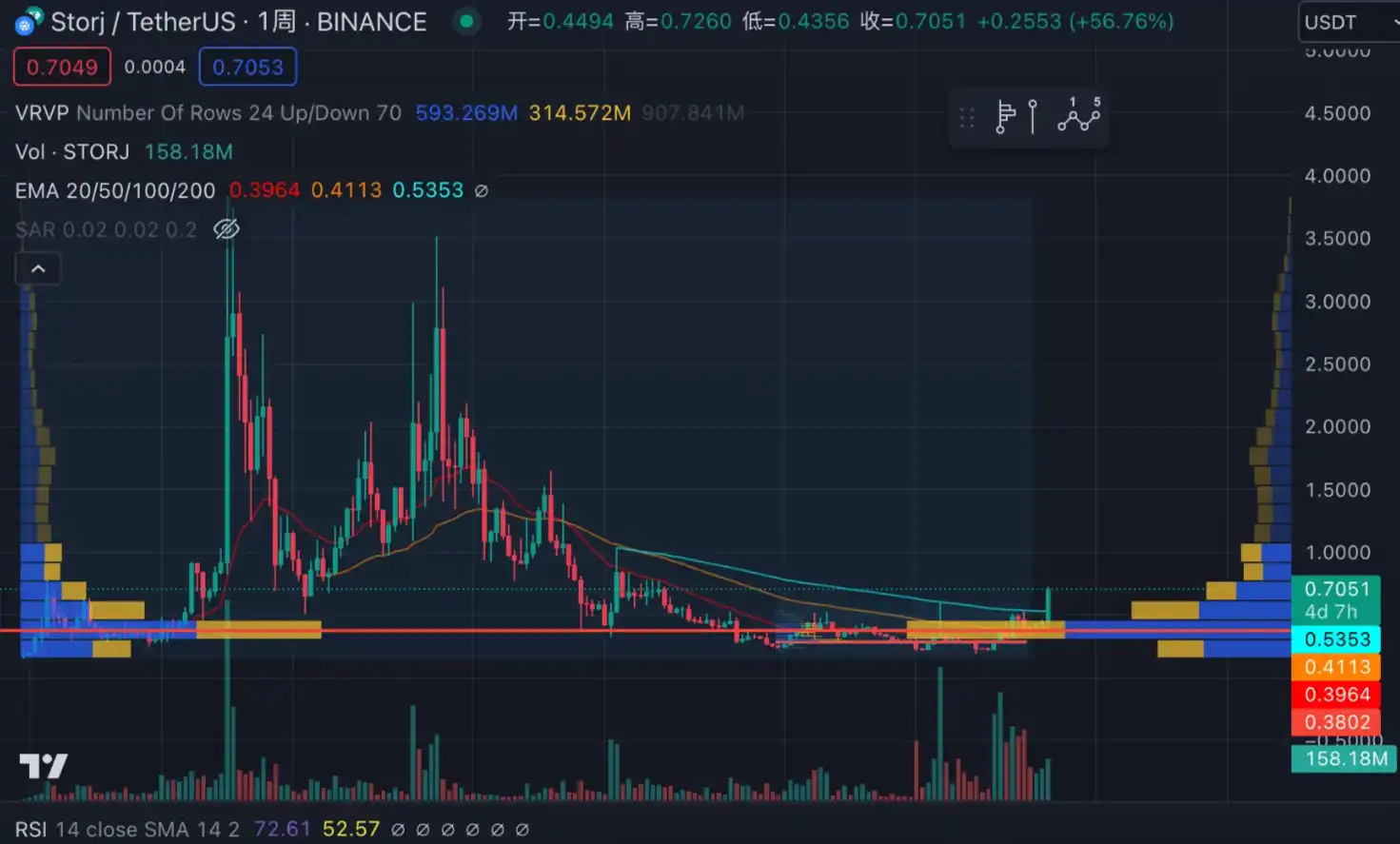 从周 K 大周期来看 STORJ 已突破今年价格高点和底部区间。底部密集成交均价 0.5353 美元,上方筹码分布较均匀。