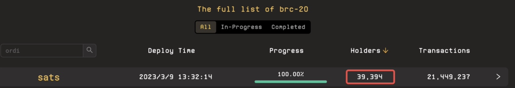 资金共识上,sats 最大的特点在于「总供应量 2100 万亿枚,每次铸造最大铸造量一亿枚」,也就是说,需要 Mint 2100 万次才能 100% Mint Out,粗略按照 BTC 链上 gas 水平一般的情况来看,100% Mint Out 至少也需要 1000 万-2000 万美金。如此高的成本让人们原本不相信 sats 可以被 Mint Out,但是,耗时 6 个月,sats 竟然被 100% Mint Out。可见其强大的资金共识。目前持有 sats 的地址数已达到 39k 个以上。