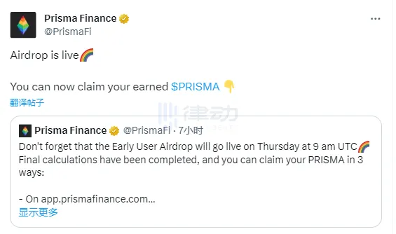 11 月 9 日,LSD 稳定币协议 Prisma Finance 空投申领现已正式上线,早期用户已可领取 PRISMA 空投奖励。 此前报道,Prisma Finance 宣布推出 Prisma 追溯性空投,锁定的 PRISMA 代币将被空投给 Prisma 积分持有者以及投票支持 Prisma 被列入 Curve 白名单的地址。PRISMA 追溯空投的目的是刺激对 Prisma 链上治理的参与,并使更广泛的社区能够充当协议开发的负责任的管理者。其中,veCRV 投票者将获得总供应量的 1%,按比例分配给所有投票者。Prisma 积分持有者将获得总供应量的 2%,按照积分比例分配给早期用户。