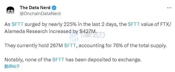 据 The Data Nerd 监测,随着 FTT 价格近两日拉升 225%,FTX/Alameda 持有的 2.67 亿枚 FTT 代币(占总供应量 76%)价值已升至 4.27 亿美元。 此外,截至目前,FTX/Alameda 持有 FTT 代币暂未发送至交易平台。