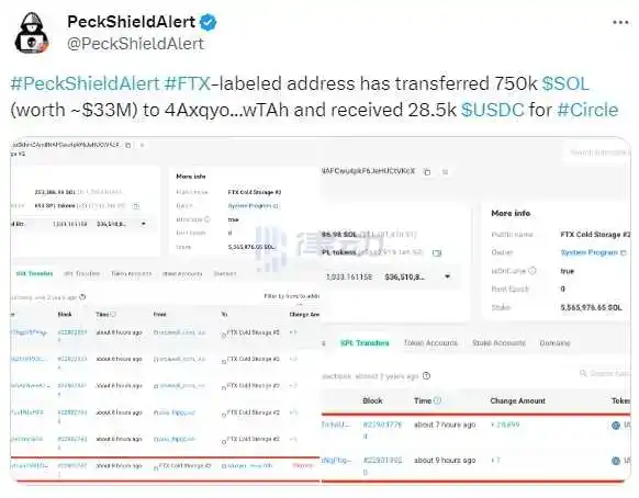 派盾:FTX 地址转移 75 万枚 SOL,价值 3300 万美元