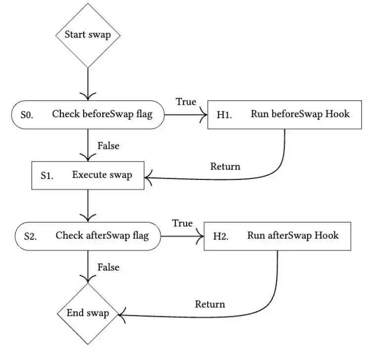 根据官方公告 [1] 和白皮书 [2],Hook、单例架构和闪电记账是实现自定义流动性池和跨多个池子实现高效路由的三个重要功能。 1.1 HookHook 指的是在流动性资金池生命周期的不同阶段运行的合约,Uniswap 团队希望通过引入 Hook 使任何人都能做出权衡决策。通过这种方式,可以实现原生支持动态费用、添加链上限价单、或者通过时间加权平均做市商 (TWAMM) 分散大订单。