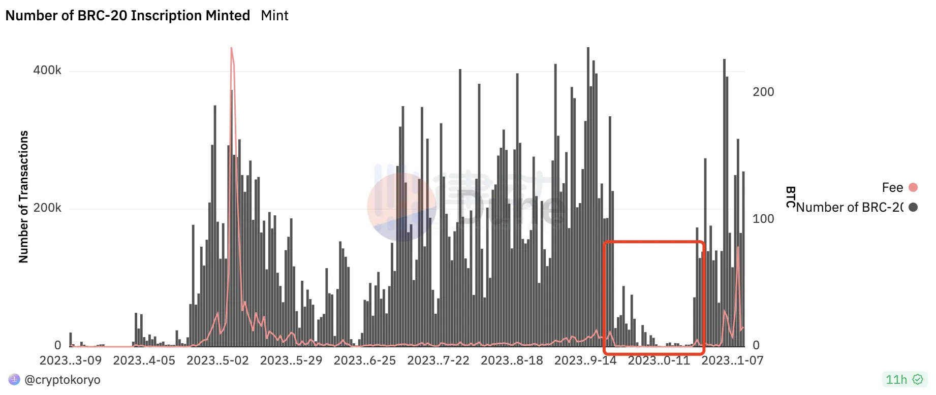 Dune 看板数据显示,Sophon 于 10 月 3 日激活后,基于文本的铭文从前一天的 49,000 个骤降到 13,700 个,下降了 72%。10 月 23 日,Sophon 的资金耗尽后的第二天,数量从 11,500 个升至 74,300 个,增幅达 540%。
