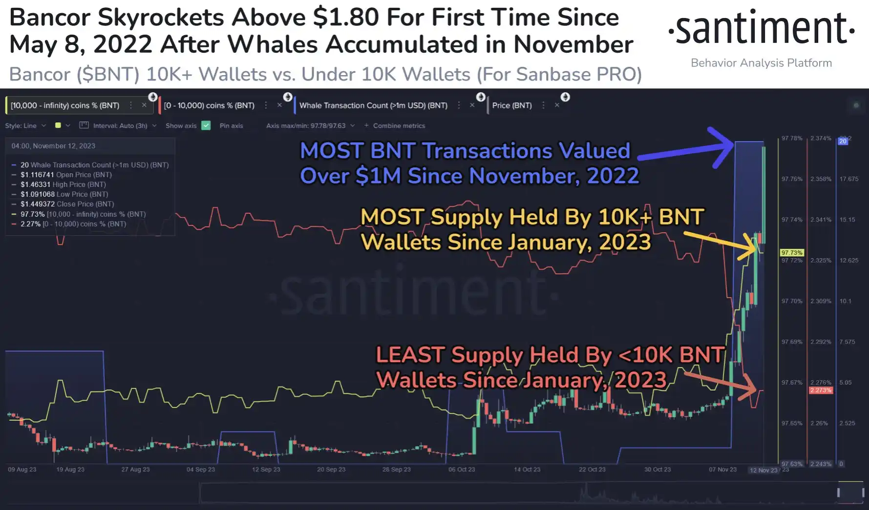 另据 Santiment 数据显示,过去 2 周,持币超 1 万枚 BNT 的地址数量达到近 8 个月新高。