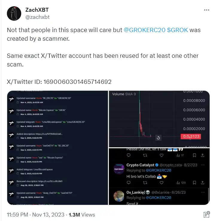 在推文中,ZachXBT 表示,「以太坊上 meme 币 GROK 由骗子创建,相同的 X/Twitter 帐户(推特 ID:1690060301465714692)已被重复用于至少一个其他骗局。」