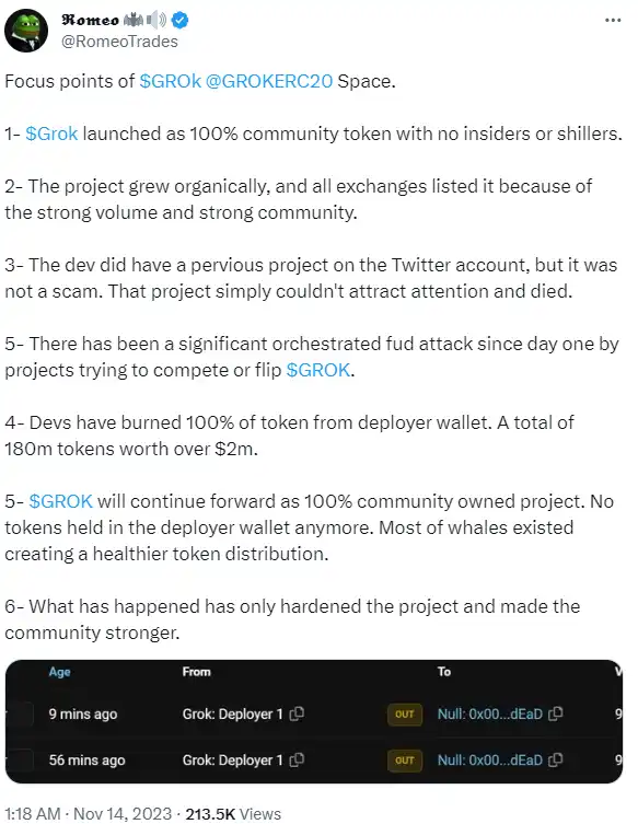 随后,社区@RomeoTrades发表长推表示,「开发者确实在 Twitter 上有过一个项目,但不是骗局。这个项目根本无法引起人们的注意,最终就夭折了」。并直言「第一天起,试图竞争或翻转$GROK的项目就发起了一场精心策划的重大虚假攻击。所发生的事情只会使项目更加坚固,并使社区更加强大。」