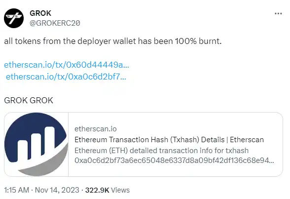 半小时后,GROK 宣布开发人员已烧毁部署者钱包中 100% 的代币。总计 1.8 亿枚代币,价值超过 200 万美元。这意味着 GROK 将成为 100% 由社区所拥有的项目,这次回应拉回了投资者的信心,使 GROK 价格在 1 小时内回涨了超 30%。
