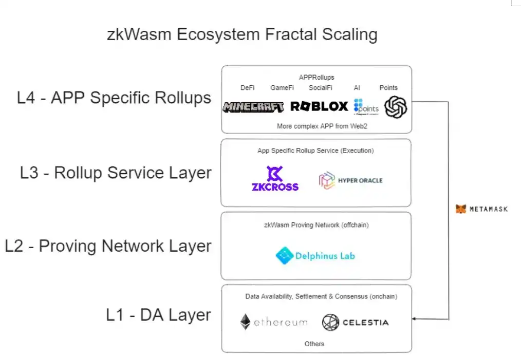zkWasm 作为 zkVM 的一支新秀,本质是通过链下解决复杂运算,链上存储证明,兼容 Web2 主流语言的思路,实现 Web2 与 Web3 的连接升级,复杂的业务逻辑链下计算,有价值的结果和证明进行上链保存,用于溯源、验真和清算,账户体系由现有的钱包体系构成,整个生态可由下图来表示: