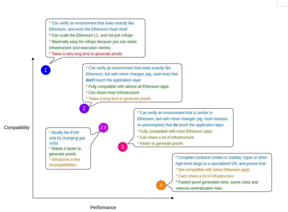 去年 8 月份 Vitalik 发布《The different types of ZK-EVMs一文,对当前主流的扩容方案从兼容性和性能两个角度进行了整体对比(参见下图),引发整个社区诞生了诸多讨论和思考直到今天。