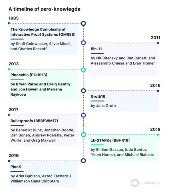 zk-SNARK(Succinct Non-Interactive Arguments of Knowledge)可能是最流行的零知识证明形式,最早出现在 2011 年的 Bit+11 论文中。到 2013 年,多亏了 Pinocchio PHGR13 论文,零知识证明可以在现实应用中使用,该论文使 zk-SNARKS 适用于一般计算,尽管速度较慢。2016 年提出的 Groth16 算法大大降低了计算复杂性,使 zk-SNARKS 非常高效,至今仍然是标准。