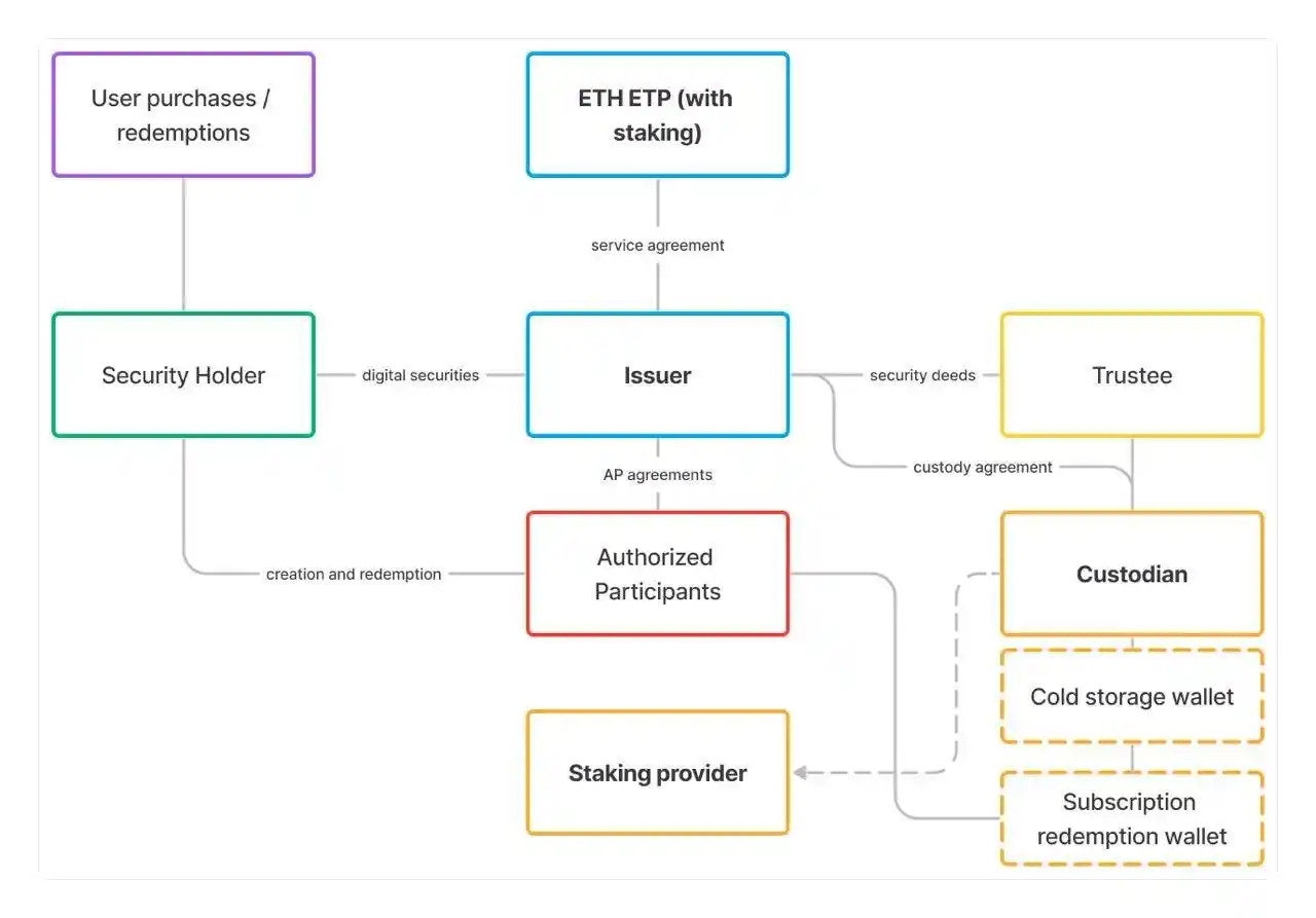 为了率先进入市场,发行方必须提出一个符合现有监管框架并能够尽快获得批准的解决方案。因此,最不费力的途径是 ETF 发行方与第三方集中化的质押投票提供商达成合同协议,包括借贷协议,后者收取少量费用。