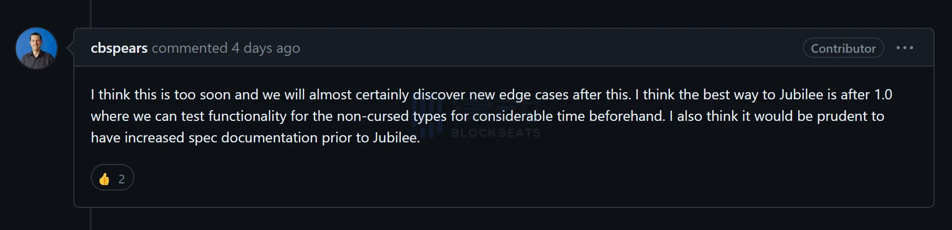 但是说「诅咒铭文」从此绝版也是不准确的,因为「诅咒铭文」本身就是「Ordinals 协议混乱的包罗万象」,就像 Windows 系统的 Bug 是无穷无尽的,修了一万个老 Bug,还会有无数个未被发现的新 Bug。在未来,可能还会有「禧年 (Jubilee)」2.0、3.0... 也因此,Ordinals 协议 Contributor @cbspears 认为,本次提出「禧年 (Jubilee)」计划为时过早,因为在之后几乎肯定会发现新的导致「诅咒铭文」出现的特殊情况。