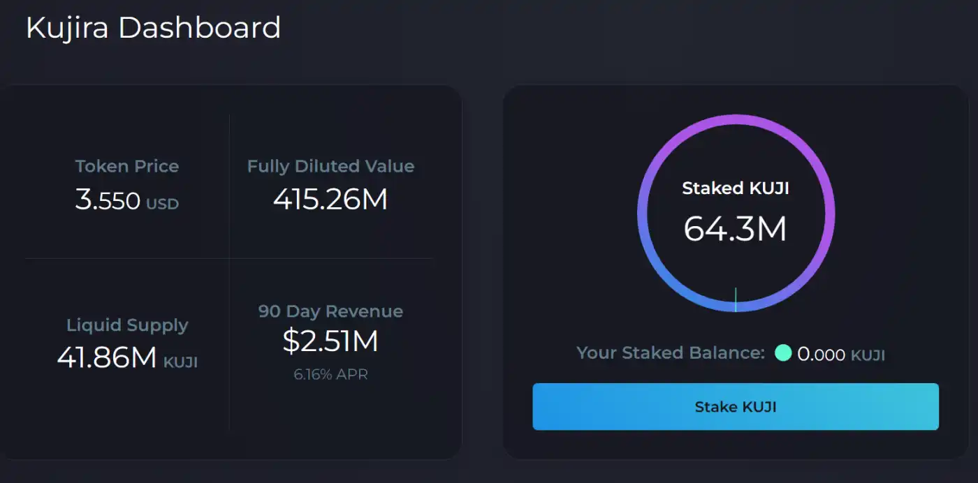 与此同时,由于 KUJI 的代币经济学允许 KUJI 质押者获得 100% 的协议费用,因此 KUJI 质押率一直在走高,目前超过 50% 的 KUJI 被质押(约 6430 万枚)。