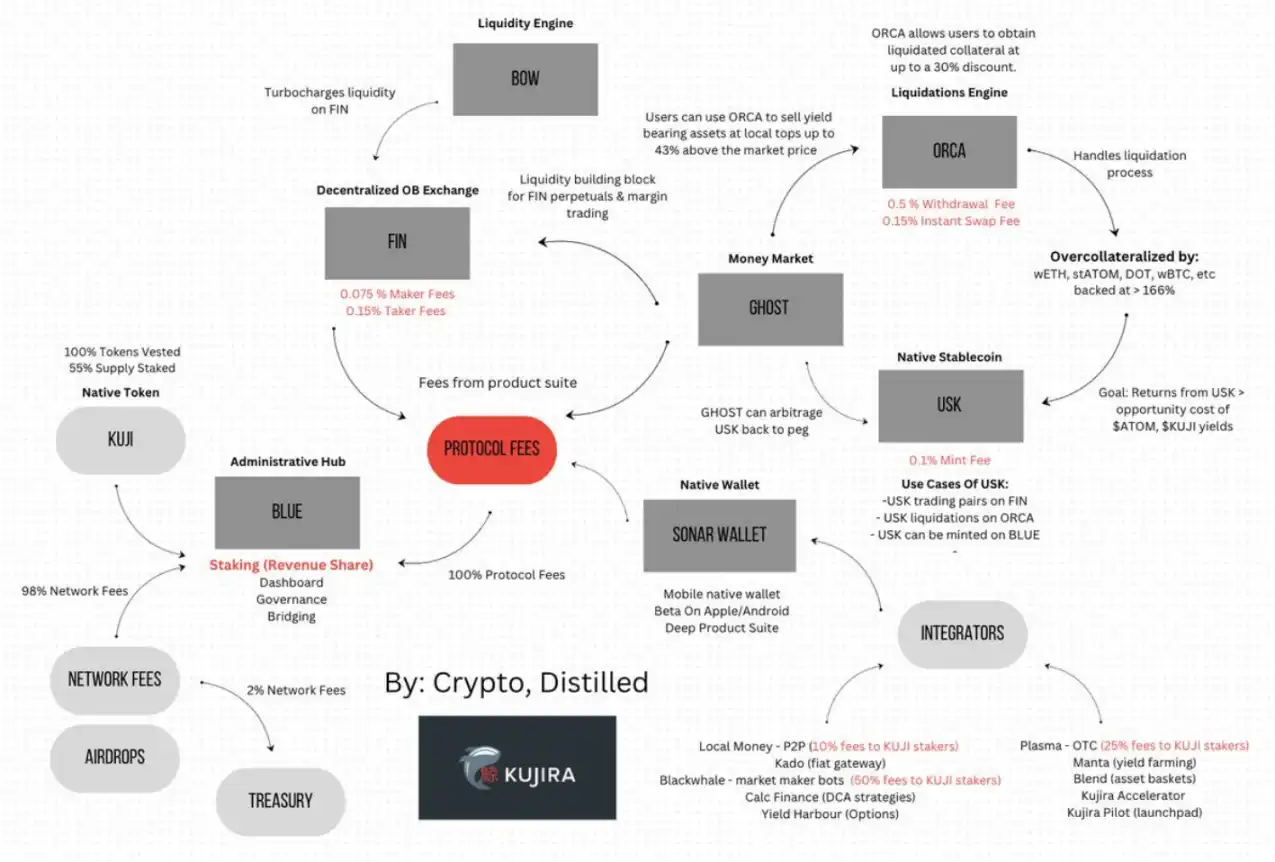 从这个角度看,Blue、Orca、FIN 确实是 Kujira 生态的基础设施,实现整个生态底层围绕(清算)资产交易&流动性的跨链流动: